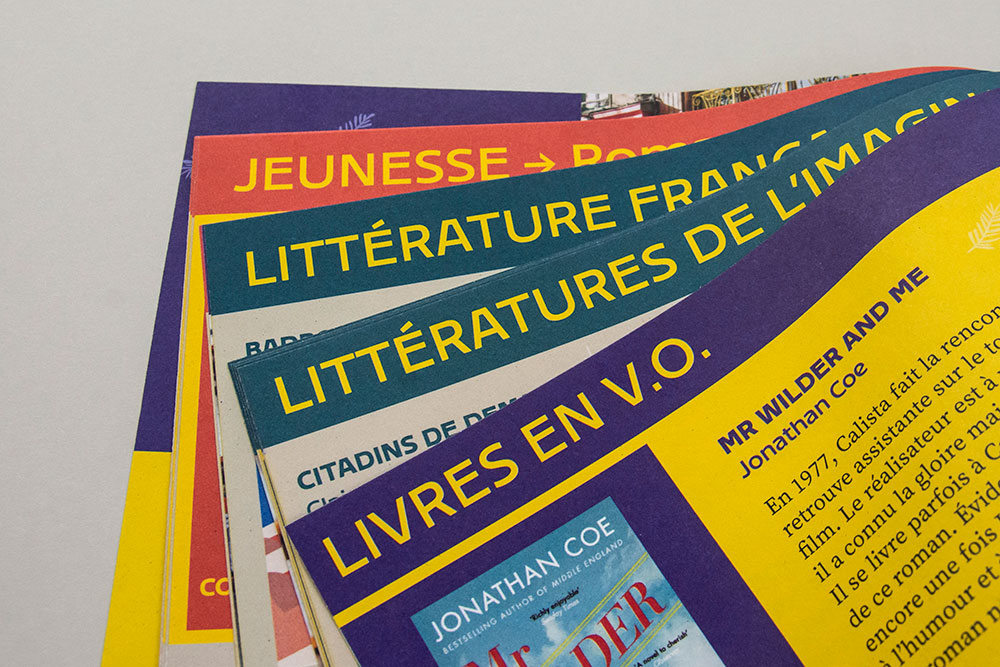 Le système graphique ou principe de mise en pages, fait écho au roman La Vie mode d’emploi de Perec (un roman dit « exhaustif » comme on peut l’attendre d’une librairie généraliste). Il place l’observateur devant ce qui pourrait s’apparenter à un immeuble constitué de plusieurs étages… Chacun représentant un rayon de la librairie symbolisé par des blocs de couleurs. L’ensemble pouvant aussi évoquer un rayonnage assemblant tailles et formes de livres différentes (grand format, poche, BD…). Le système graphique modulaire et multiple ainsi créé est facilement déclinable en interne.